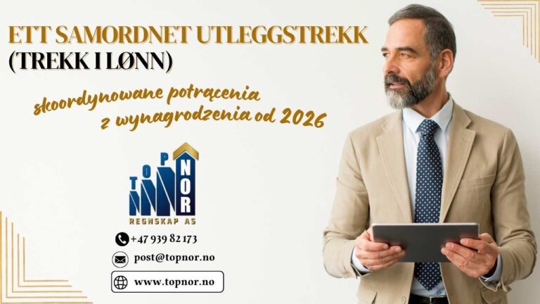 Od 1 stycznia 2026 weszła w życie nowa ustawa o egzekucji należności państwowych. Zmiany mają uprościć proces potrąceń z wynagrodzenia (utleggstrekk) zarówno dla pracodawców, jak i pracowników. Jedno skoordynowane potrącenie z wynagrodzenia Dotychczas pracownik mógł mieć kilka potrąceń jednocześnie, np. od: – Skatteetaten – Gminy – Komornika / policji – Firm windykacyjnych Od 2026 r. wszystkie zatwierdzone roszczenia będą łączone w jedno wspólne potrącenie z pensji pracownika. Nawet jeśli pracownik ma wielu wierzycieli, będzie realizowane tylko jedno potrącenie. Co to oznacza dla pracodawcy? Nowe zasady wprowadzają duże uproszczenie: – Nakaz potrącenia (trekkpålegg) będzie wysyłany elektronicznie przez Altinn – Będzie można go automatycznie wczytać do systemu płacowego – Najczęściej będzie podany jako procent brutto – Płatność należy wykonać dzień po wypłacie wynagrodzenia – Środki trafiają wyłącznie do Skatteetaten, który rozdziela je między wierzycieli – Skatteetaten pilnuje salda i informuje, kiedy potrącenie należy zakończyć – Pracodawca otrzymuje tylko minimalne informacje, co zwiększa ochronę danych pracownika Wszystkie potrącenia sprzed 01.01.2026 Wszystkie potrącenia sprzed 1 stycznia 2026 r. nadal obowiązują na dotychczasowych zasadach. Od 2026 r. nowe potrącenia są realizowane w formie jednego skoordynowanego potrącenia z pensji. Jak wpłacać potrącenia? Stare zasady (dla spraw rozpoczętych przed 2026): Wpłata dzień po wypłacie (nie wraz z AGA-SKATT) Na dotychczasowe konto KID generujesz samodzielnie Nowe skoordynowane potrącenia: Wpłata dzień po wypłacie Konto i KID podany w nakazie potrącenia (dokładne informacje podaje Skatteetaten) KID jest unikalny dla pracownika Raportowanie w a‑melding W a‑melding od stycznia 2026 r. należy rozróżniać nowe skoordynowane potrącenia (samordnet utleggstrekk) i dotychczasowe potrącenia podatkowe (utleggstrekk skatt). Inne starsze potrącenia nie są raportowane. Co to oznacza praktycznie dla pracodawcy? Jeżeli masz pracowników: – Od 2026 r. będzie mniej administracji – Nie trzeba kontaktować się z wieloma wierzycielami – Wystarczy wykonać jedną wpłatę – Należy pilnować płatności dzień po wypłacie – System płacowy powinien być zaktualizowany do nowych wymogów Jak wykonywać potrącenie? – Potrącenie realizuje się przy pierwszej możliwej wypłacie po otrzymaniu nakazu – Jeśli potrącenie podano jako procent – liczymy od wynagrodzenia brutto – Jeśli kwota jest stała – potrącamy maksymalnie tyle, ile pozwala wynagrodzenie – Przy feriepenge nadal potrąca się normalnie – Maksymalna kwota potrącenia jest określona w nakazie – Jeśli pracownik spłaci dług bezpośrednio – Skatteetaten zajmuje się zwrotem Okres przejściowy 2026–2029 – Mogą jeszcze istnieć stare potrącenia według poprzednich zasad – Możliwe kilka równoległych potrąceń Po otrzymaniu nowego skoordynowanego potrącenia: – Należy zakończyć wszystkie inne potrącenia – Realizować tylko jedno wspólne potrącenie TOPNOR REGNSKAP AS to autoryzowane biuro księgowe w Norwegii, które kompleksowo wspiera przedsiębiorców w prowadzeniu działalności gospodarczej. Oferujemy szybkie i rzetelne usługi księgowe, rozliczenia podatkowe, obsługę VAT oraz doradztwo finansowe. Każdemu klientowi zapewniamy bezpłatną pierwszą konsultację, podczas której odpowiadamy na wszystkie pytania i pomagamy wybrać najbardziej optymalne rozwiązania dla jego firmy. +47 939 82 173 post@topnor.no www.topnor.no