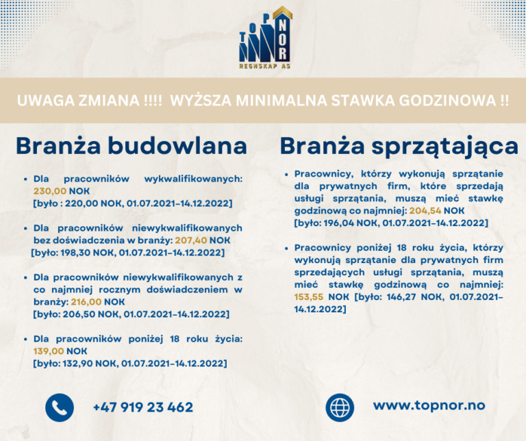 ENKELTPERSONFORETAK – Firma Jednoosobowa w Norwegii Dziś przedstawimy Wam charakterystykę ENK w Norwegii wraz z kilkoma poradami dla osób rozważających tę formę działalności. · Najprostsza forma działalności. Do założenia wymagany jest tylko numer personalny. Brak opłat za założenie firmy do 2023 roku. Od roku 2024 opłata wynosi 2499kr. · Właściciel nie może być zatrudniony we własnej jednoosobowej działalności gospodarczej (ale można mieć pracowników – możliwość zatrudnienia pracowników, także dzieci, ale nie współmałżonka). · Firma jednoosobowa jest prowadzona przez jedną osobę, która jest odpowiedzialna za wszystkie aspekty działalności. · Właściciel firmy jednoosobowej ponosi pełną odpowiedzialność finansową za zobowiązania przedsiębiorstwa. Co ważne w tym przypadku, jego prywatny majątek może być zagrożony w przypadku problemów finansowych firmy. · Nie jest odrębnym podmiotem prawnym. · Ta forma działalności nie jest zbyt przyjazna dla inwestorów. · Dochody z firmy jednoosobowej są uznawane za dochody właściciela i opodatkowywane według jego stawek podatkowych. · Podatek dochodowy 22%. · Składki na ubezpieczenie 11,4 %. · Zaliczki na podatek dochodowy płatne 4x w roku. · Przyjazna forma prowadzenia księgowości · Możliwość dowolnego korzystania ze środków na rachunku bankowym. · Proces rejestracji firmy jednoosobowej jest dosyć prosty. Właściciel musi zgłosić działalność do norweskiego urzędu skarbowego (Skatteetaten). Właściciel firmy jednoosobowej zobowiązany jest do składania rocznych sprawozdań finansowych i podatkowych. Koszty założenia firmy jednoosobowej są znacznie niższe niż spółki AS, ponieważ nie ma wymogu wniesienia kapitału założycielskiego. Również koszty administracyjne w Rejestrze Brønnøysund są niższe. Jeśli chodzi o rejestrację w Foretsksregister, czyli rejestrze podmiotów gospodarczych, jest ona obowiązkowa w przypadku firm jednoosobowych zatrudniających co najmniej 5 pracowników oraz firm zajmujących się sprzedażą towarów nieprodukowanych przez firmę. Właściciel firmy jednoosobowej nie jest jej pracownikiem, dlatego też nie ma wszystkich przywilejów związanych z zatrudnieniem. Dochód z firmy jednoosobowej nie stanowi podstawy do otrzymania zasiłku dla bezrobotnych. Właściciela firmy jednoosobowej nie obejmują również przepisy zawarte m.in. w Kodeksie Pracy, Ustawie Urlopowej, Ustawie o Postojowym (permittering), Ustawie o Ubezpieczeniu od Wypadków przy Pracy, itd Podatek dochodowy należy opłacać w trybie zaliczek – ich kwota jest wyliczana przez urząd. Płatność podatku dochodowego dla firm jednoosobowych: – deklaracja wysokości zysku (po rozpoczęciu działalności bądź na początku roku kalendarzowego), – zaliczki na podatek dochodowy (płatne 15 marca, 15 czerwca, 15 września i 15 grudnia), – złożenie zeznania podatkowego (do 31 maja roku następnego). Ważne! Bądź ostrożny przy szacowaniu dochodu. Jeśli założysz duży zysk, zapłacisz większą zaliczkę na podatek. Jeśli zdecydujesz się na niższą wersję dochodu, a będzie on wyższy niż przewidywałeś, będziesz zobowiązany dopłacić podatek do 31 maja roku następnego. Jeśli firma jednoosobowa nie posiada pracowników, właściciel nie ma obowiązku przejścia szkolenia BHP (HMS). Właściciele firmy jednoosobowej, w której zatrudniony jest chociaż jeden pracownik mają obowiązek przejść szkolenie BHP (HMS) dla kierowników (Daglig leder). Masz pytania? Zapraszamy do kontaktu! TOPNOR REGNSKAP AS Twoje Polskie Autoryzowane Biuro Księgowe +47 939 82 173 post@topno.